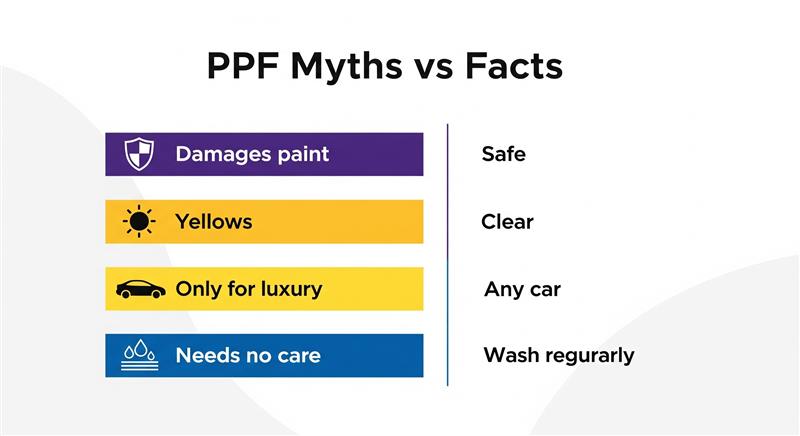 PPF myths debunked show that paint protection film for cars is not just for luxury vehicles. It protects your car from scratches, chips, and UV damage. Many car owners avoid it because of wrong ideas about yellowing, high costs, or constant maintenance. The truth is that high-quality PPF lasts for years, keeps your paint looking new, and adds value to your car.